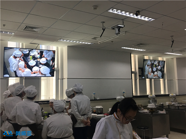 實訓(xùn)基地主要供學(xué)生學(xué)習(xí)、訓(xùn)練西點西餐制作技能使用。老師只需站在帶有奧威亞全高清云臺攝像機的工位上進行示范操作,學(xué)生們就可以通過課室里的高清大屏方便地觀看與學(xué)習(xí),而不需要里三層外三層地圍著老師。這種做法,避免了傳統(tǒng)實訓(xùn)中因場地、人數(shù)等限制因素而產(chǎn)生的教學(xué)質(zhì)量下降的問題。